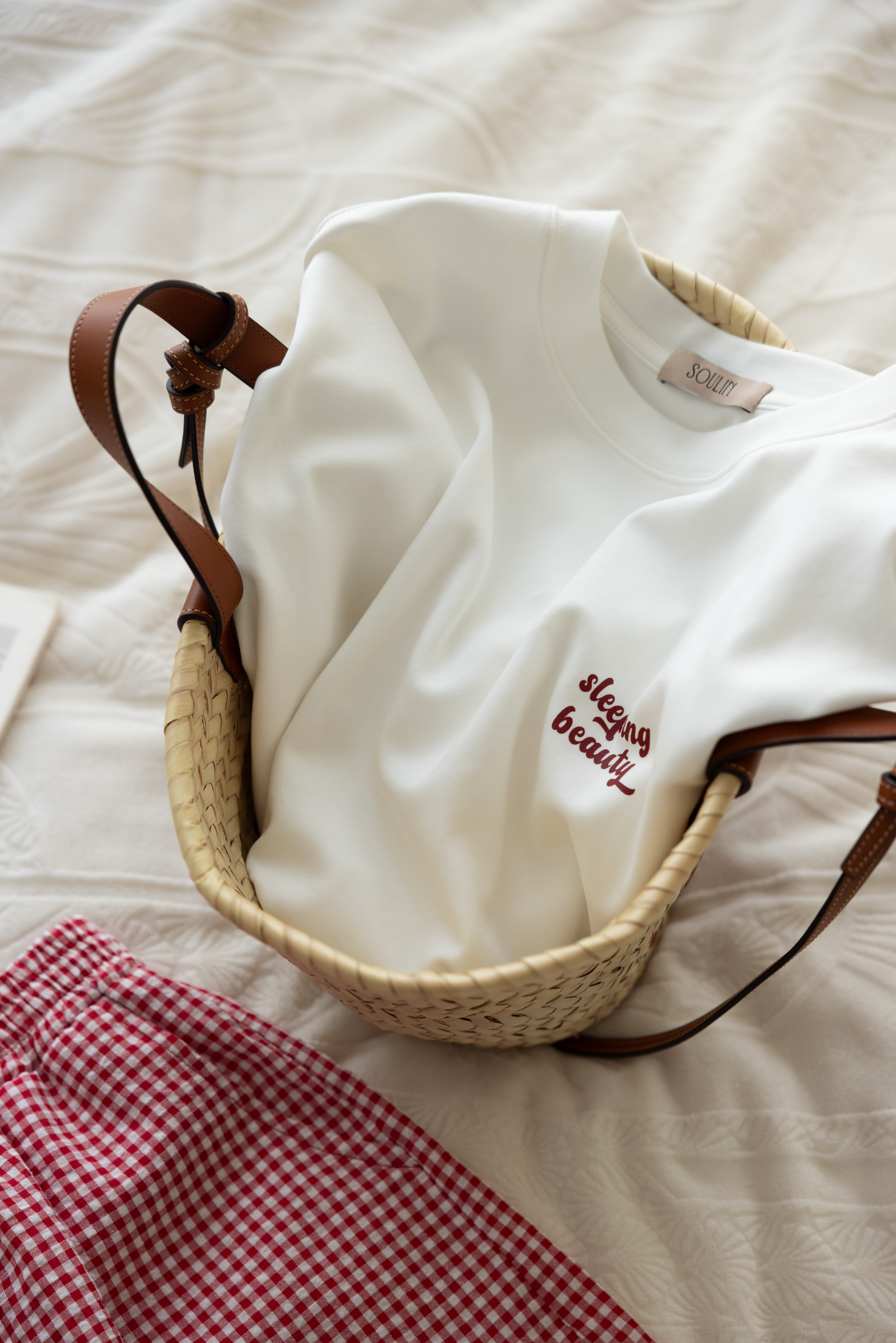 oversize設計 / 上身前面英文設計 /  下身整圈彈性腰頭 / 下身半截內裡 / 下身兩側雙口袋