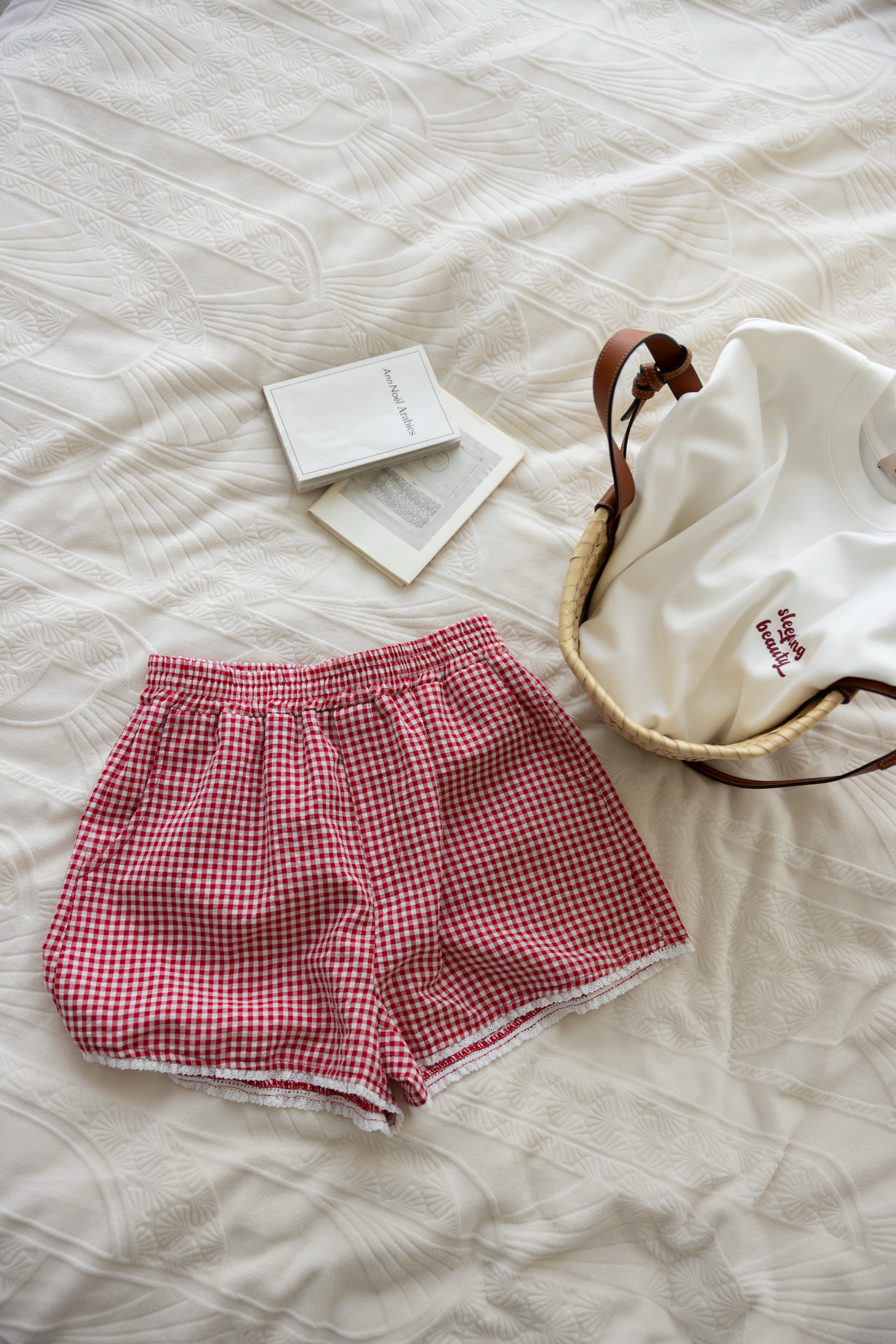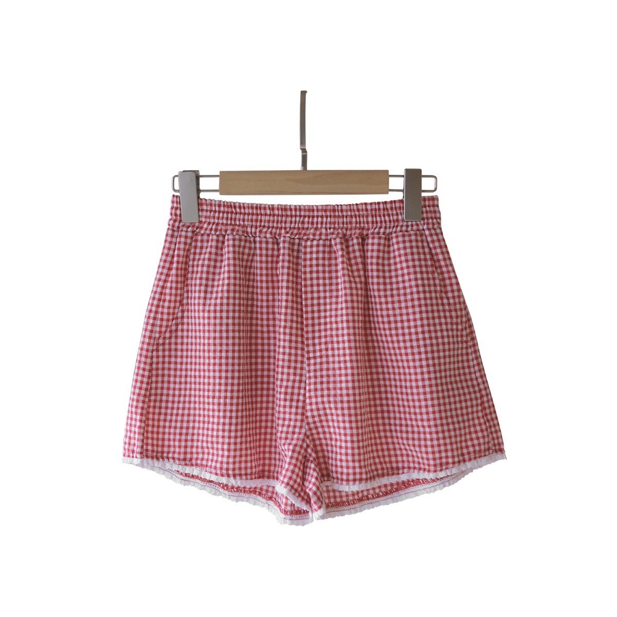 下身為可愛的格紋短褲,拼接細緻布蕾絲