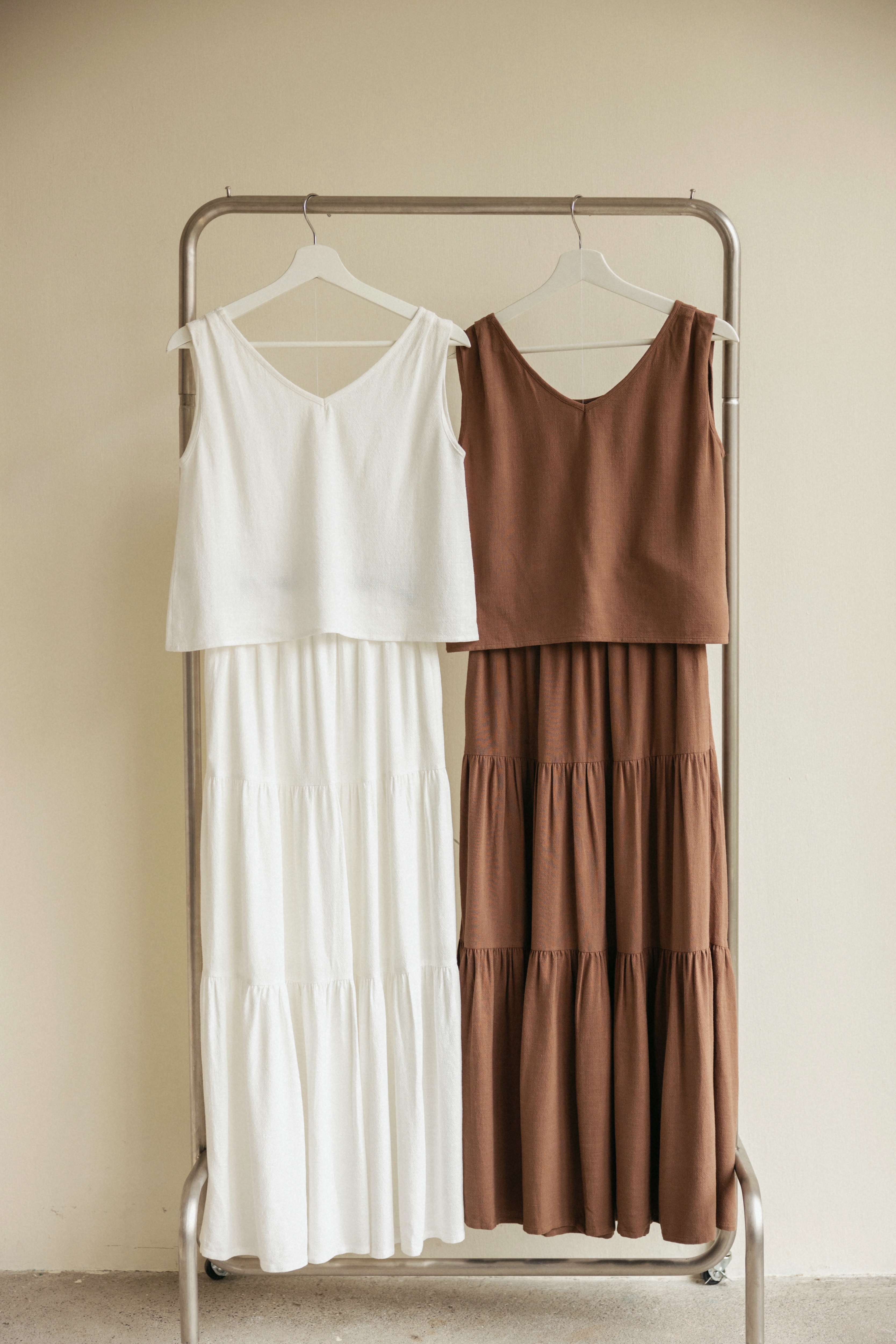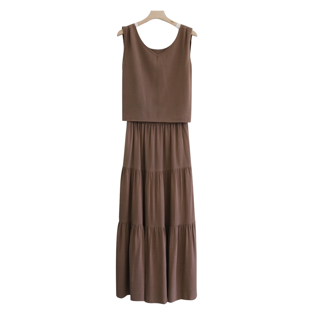 法式棉麻背心長裙SET-咖